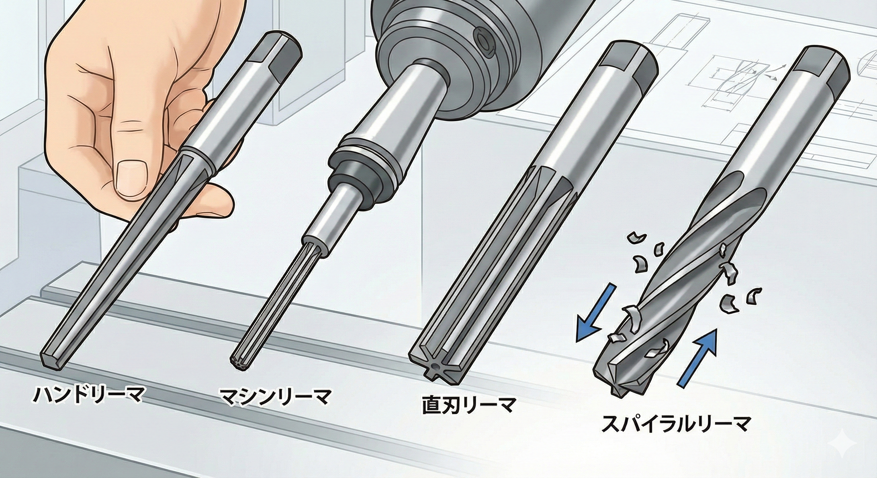 一方、旋盤などの工作機械に取り付けるのがマシンリーマで、食いつき部が短く、効率的に加工できるように設計されています。